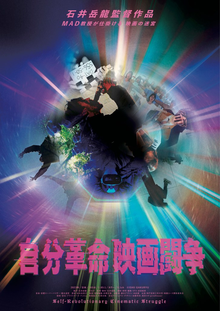 | SYNOPSIS | Gakuryu ISHII, a professor at the Kobe Design University film course, suddenly disappears, driven into a state of madness by the practice of his own ideology, the “Self-Revolutionary Cinematic Struggle”. His colleague, Assistant Professor TAKEDA, and his assistant TANIMOTO are baffled by the treatment of his “work textbook for the revolution of the inner consciousness, which aims at the expansion of the individual imagination and perception, and the strengthening of the will”. After some conflicts, they choose to try the work with voluntary students, while Takeda follows the shadow of the missing Ishii, which eventually leads to a mysterious cave exploration. By practising the texts they have chosen, the students find themselves lost in a labyrinthine world of expanded imagination and expanded consciousness, as if in a film. Through this experience, they become aware of the invisible shadowy pressures that constrain their will, imagination and perception, and of the sense of stagnation, powerlessness and isolation that covers them. However, Ishii, the man who disappeared, is slaughtered by a symbolic shadow pressure during the ultimate work he was doing deep in the mountains beyond the cave. But the film is stopped and the real world is documented. The director, Professor Ishii, is confused and distressed about the direction of his work while editing the film “Self-Revolutionary Film Struggle” with Takeda. He hides his difficulties and devotes himself to rehearsals, persuading the students who do not understand the intentions of the script for the rest of the shoot, in order to break the stalled production and rebuild the film. Suddenly, however, an unprecedented corona disaster strikes, which also affects the filming of the film, leading to the closure of the university and a ban on extracurricular activities. |